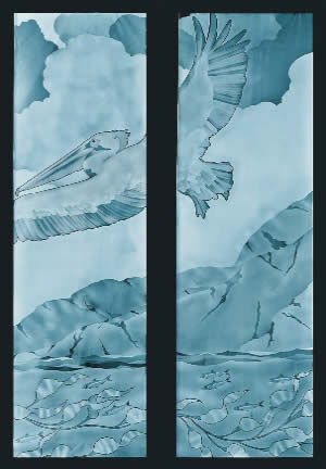 These beautiful Etched Glass Pelican windows were custom designed above an entryway in a Coastal San Diego home. They were designed to provide privacy for their second story living area from new homes that were developed across the street.